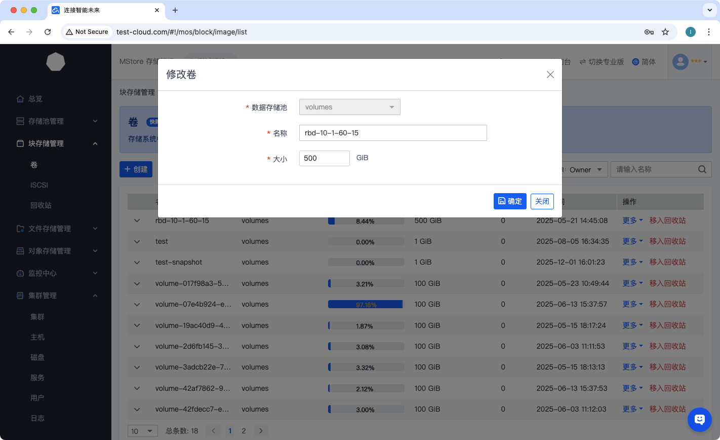 当前系统仅支持卷的“容量扩容”操作,不支持缩容及存储池、名称修改,避免因规格变更导致数据损坏。