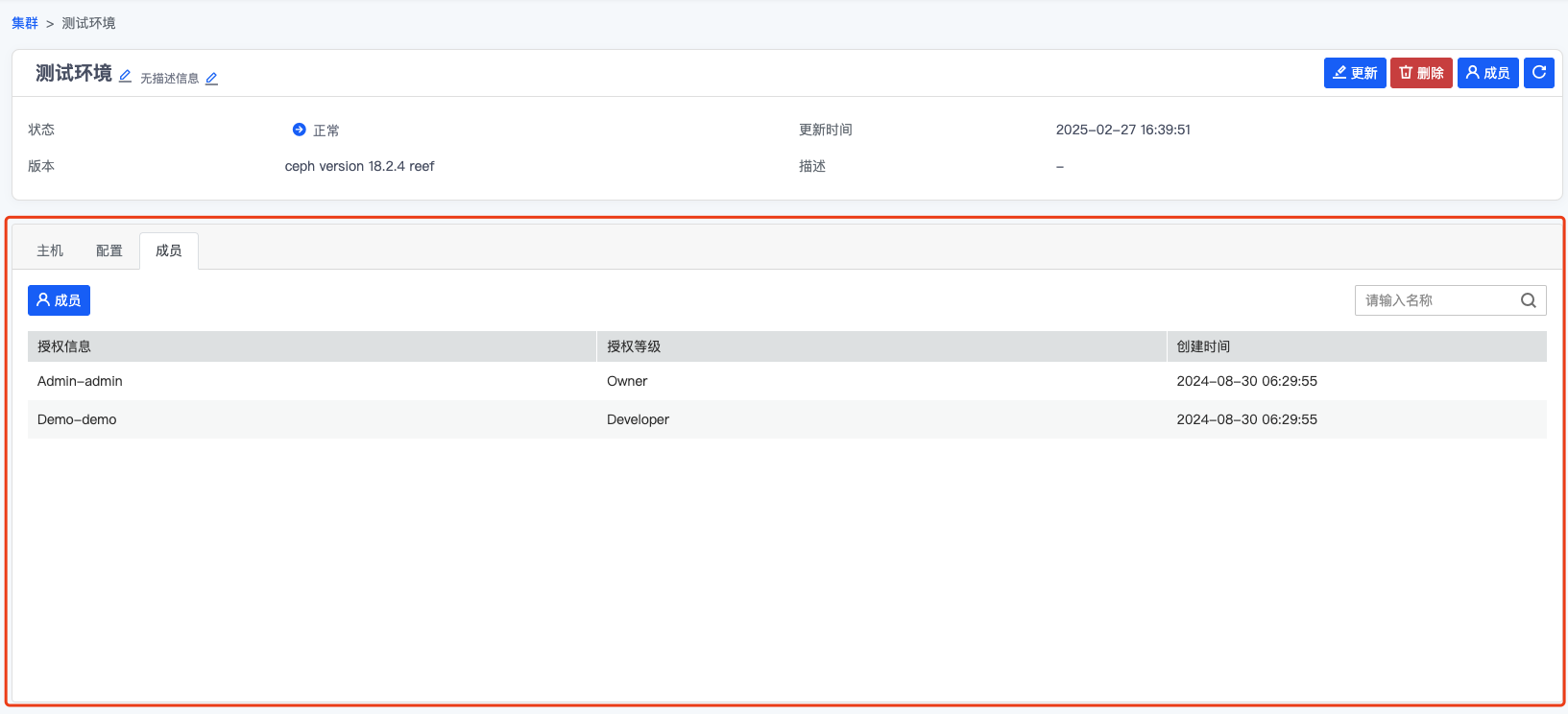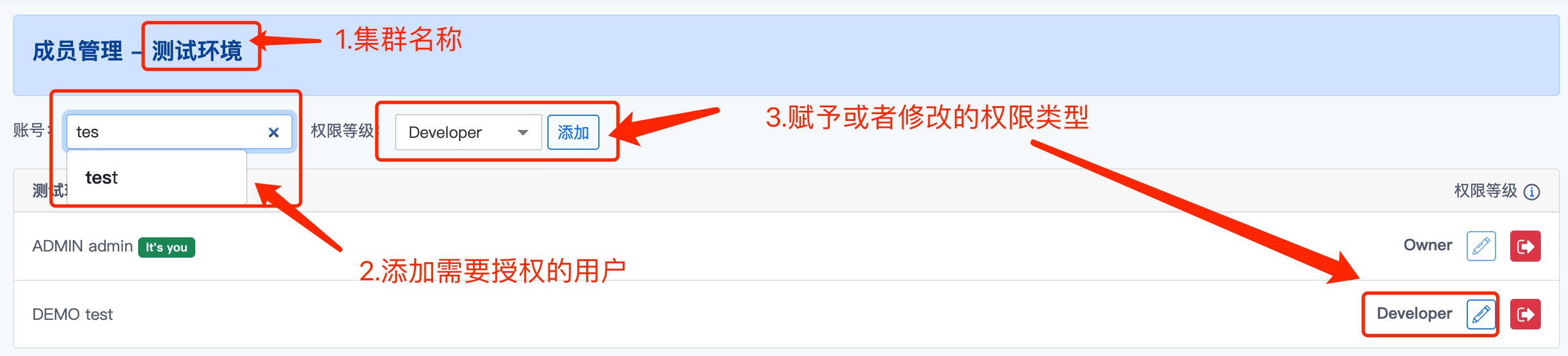 通过集群详情页面,点击页面按钮成员管理进入权限页面。
