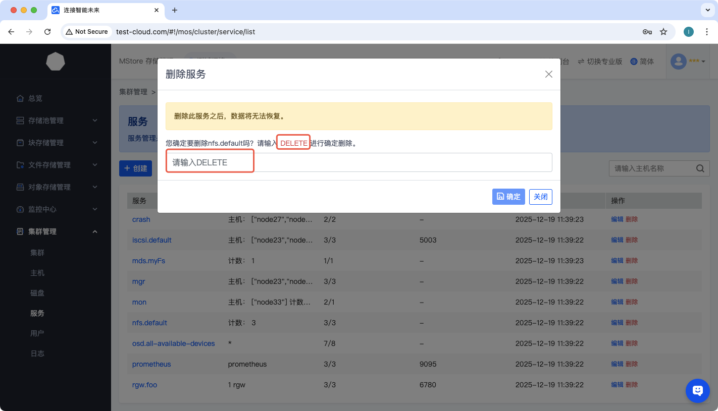 在集群页面中,找到 「服务」 菜单,可以查看集群中所有服务实例,包括 MON、MGR、OSD、MDS、RGW 等。