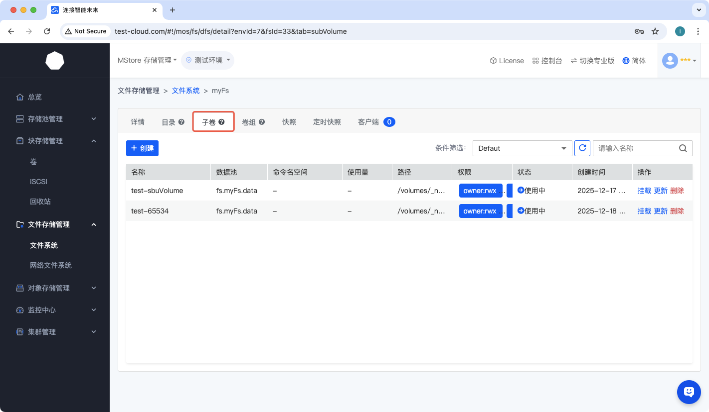 - 展示信息:子卷名称、所属数据池、空间使用量、访问路径、权限(如读写/只读)、创建时间;