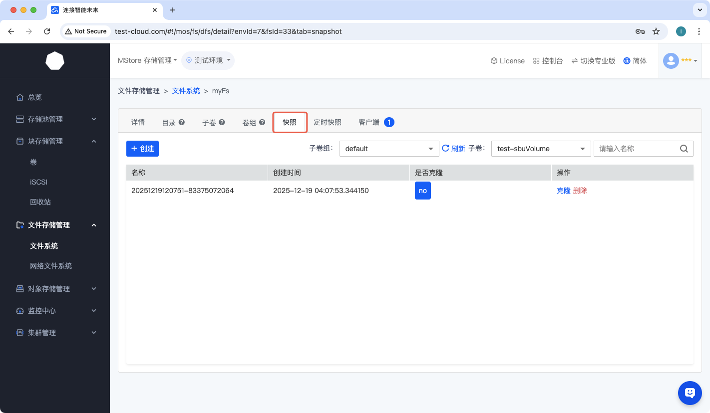 - 展示信息:快照名称、创建时间、是否已克隆为新文件系统;