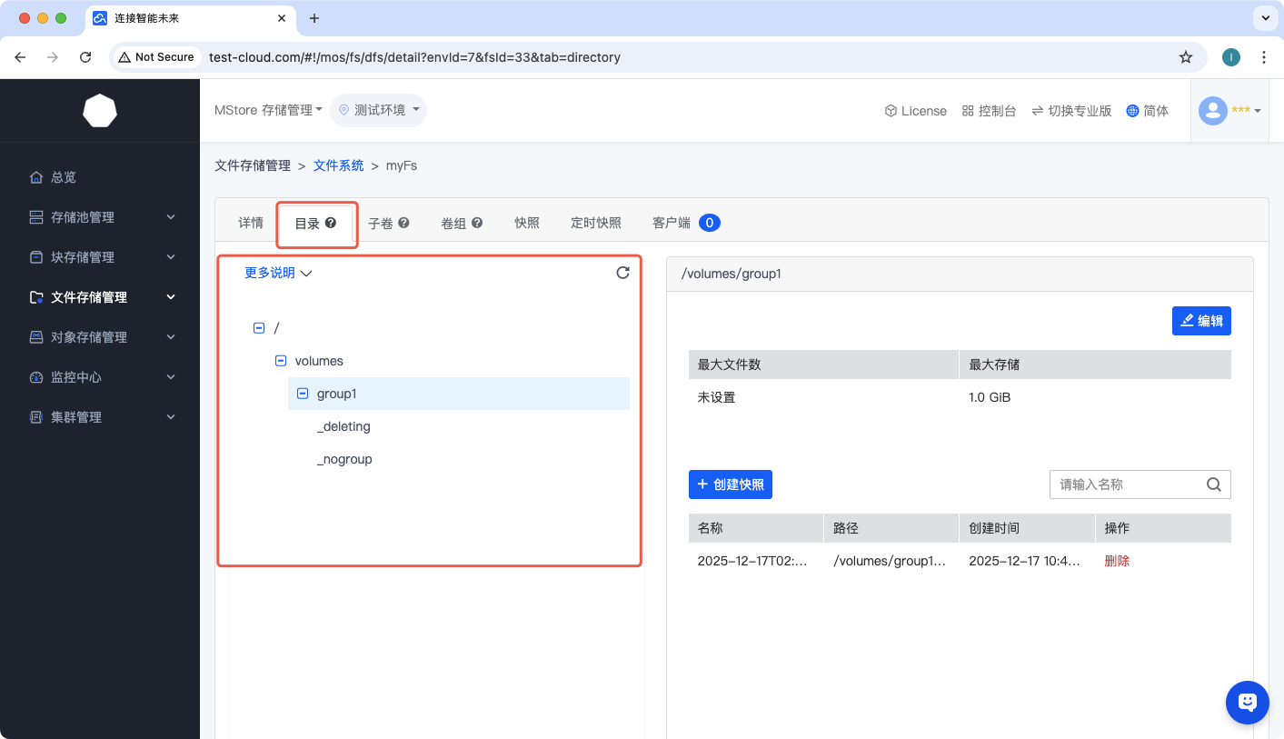 - 点击目标目录名称,右侧区域将同步显示该目录的资源限制、快照等管理功能。