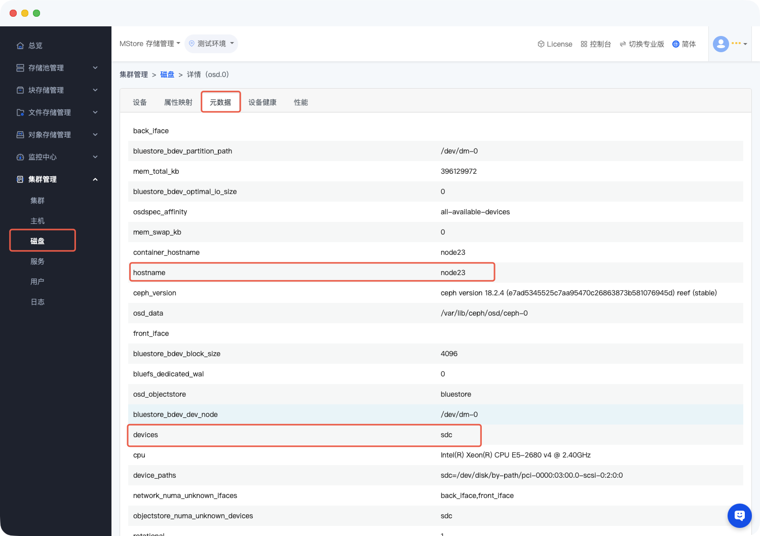 在 集群管理 -> 磁盘 页面,点击目标 OSD 盘的名称,进入元数据详情界面。