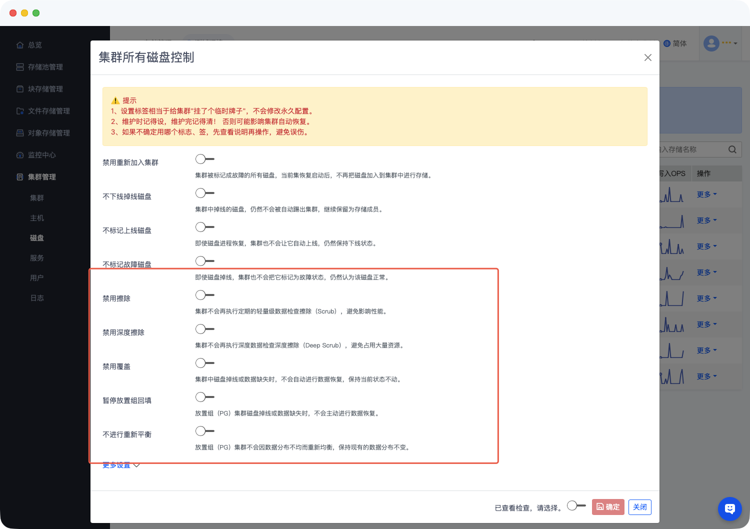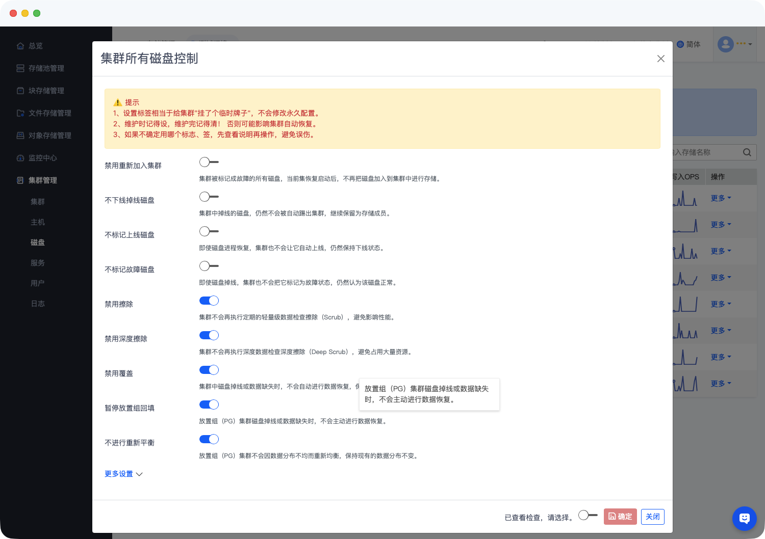 在左侧导航栏精准定位 集群管理 -> 磁盘 模块,进入磁盘全局管控页面。点击集群磁盘控制按钮,启用以下核心