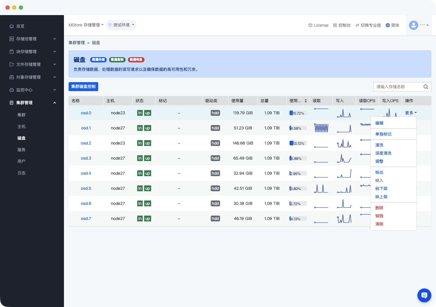- 标出:将 OSD 标记为待维护状态,集群自动规避该盘的读写操作。
