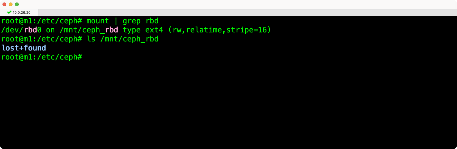 /dev/rbd0 on /mnt/ceph_rbd type ext4 (rw,relatime,stripe=16)