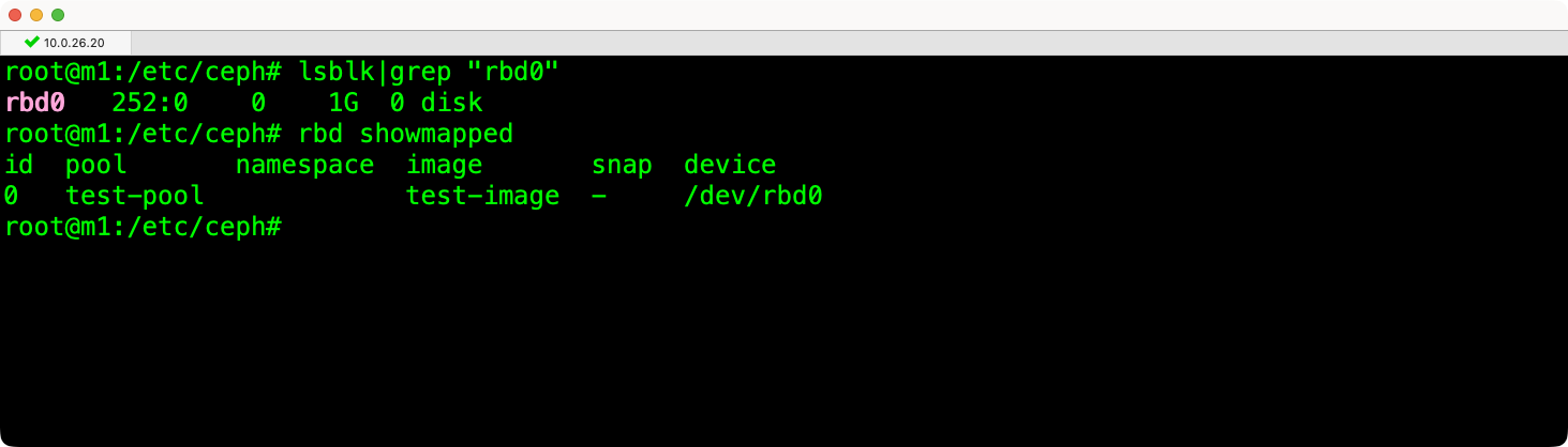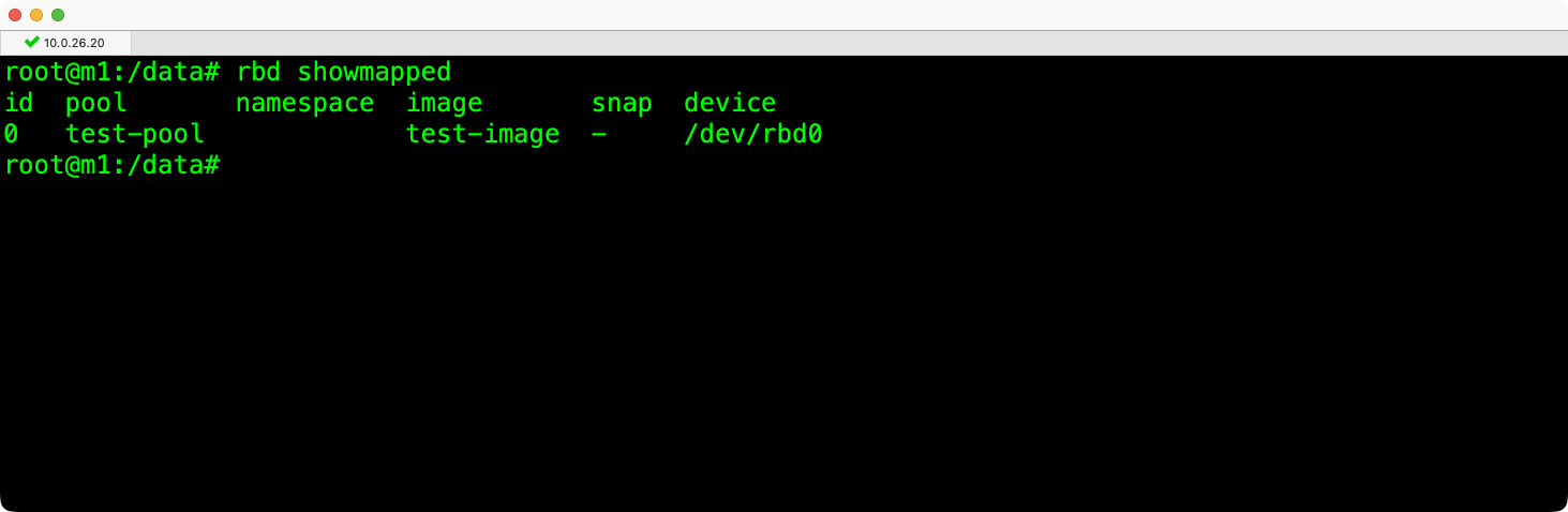 0 test-pool - test-image - /dev/rbd0执行后可在输出中找到类似rbd0的设备条目,即为映射生成的本地块设备。