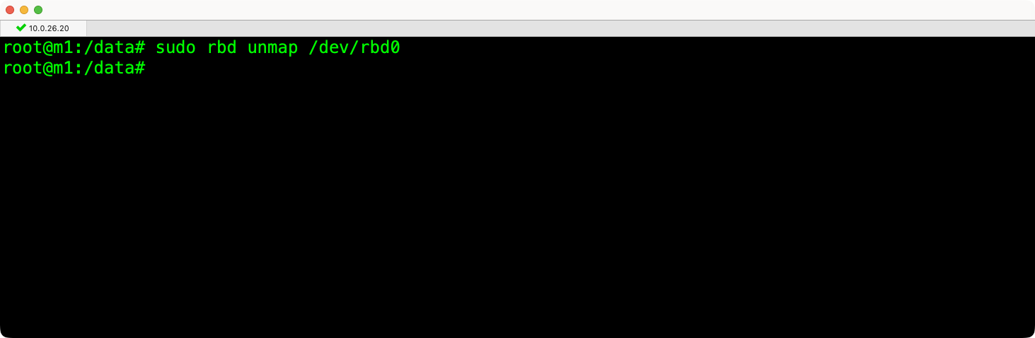 执行rbd unmap命令后,再次执行rbd showmapped,上述对应条目会消失,说明映射已成功解除。