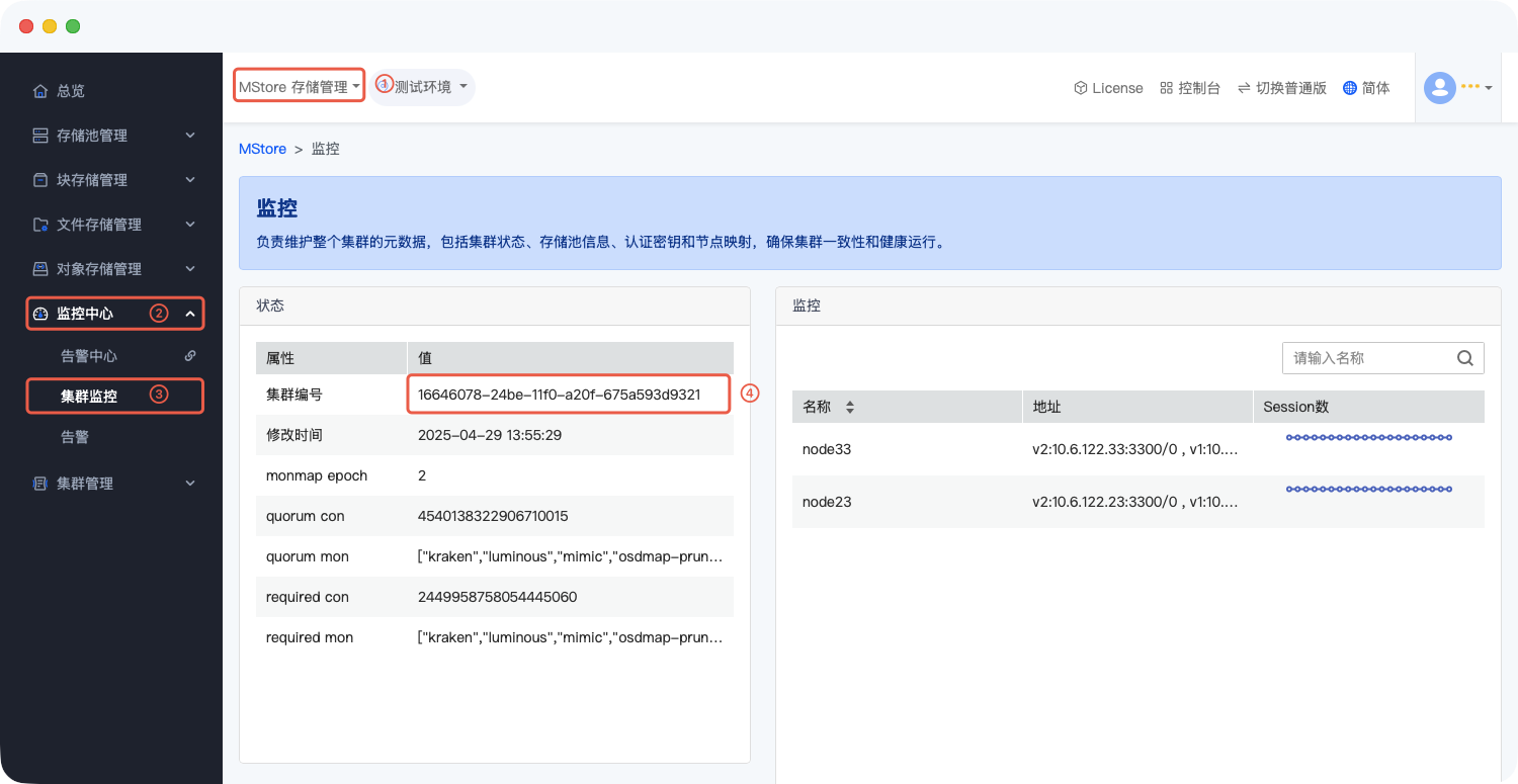 - 在“状态”属性模块中,找到“集群编号”字段,其对应的值即为 FSID。