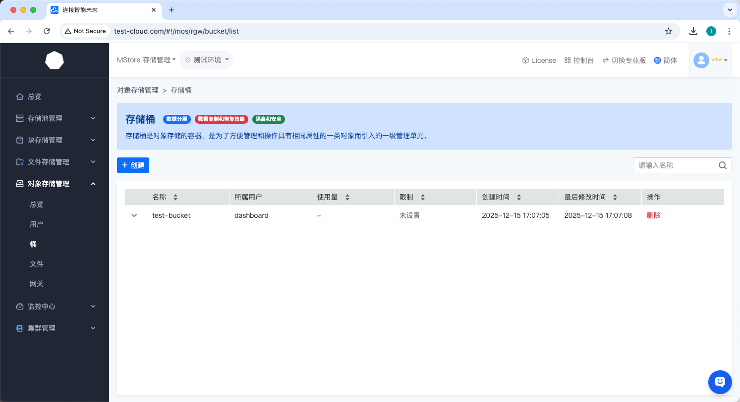 在左侧导航栏中,依次点击 对象存储 -> 桶,即可进入存储桶列表页面。
