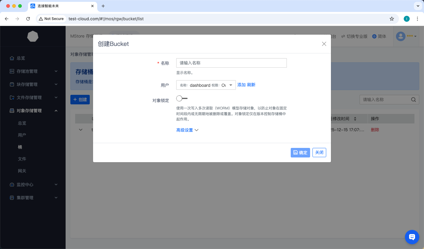在存储桶列表中找到目标存储桶,点击其 “操作” 列的删除按钮,弹出 “删除对象存储桶” 确认弹窗。 - (二)删除确认弹窗说明