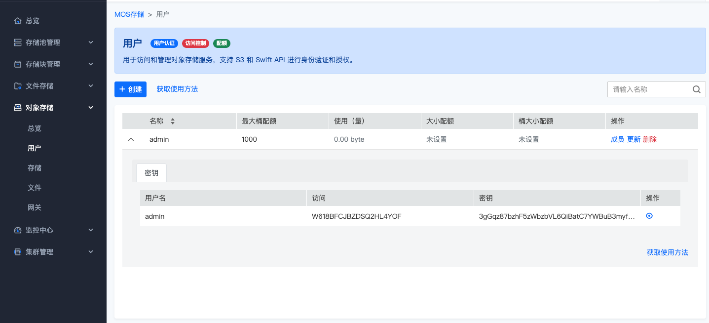 - 找到需用于对接的 RGW 用户(如obj-test-user),点击该用户 “操作” 列的 获取使用方法(或 “访问凭证”)入口;