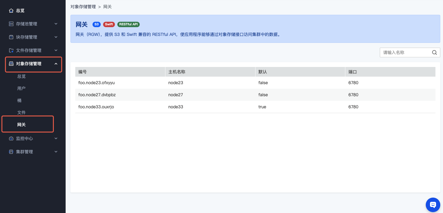 - 在左侧导航栏依次点击 对象存储 → 网关,进入 RGW 网关列表页面;