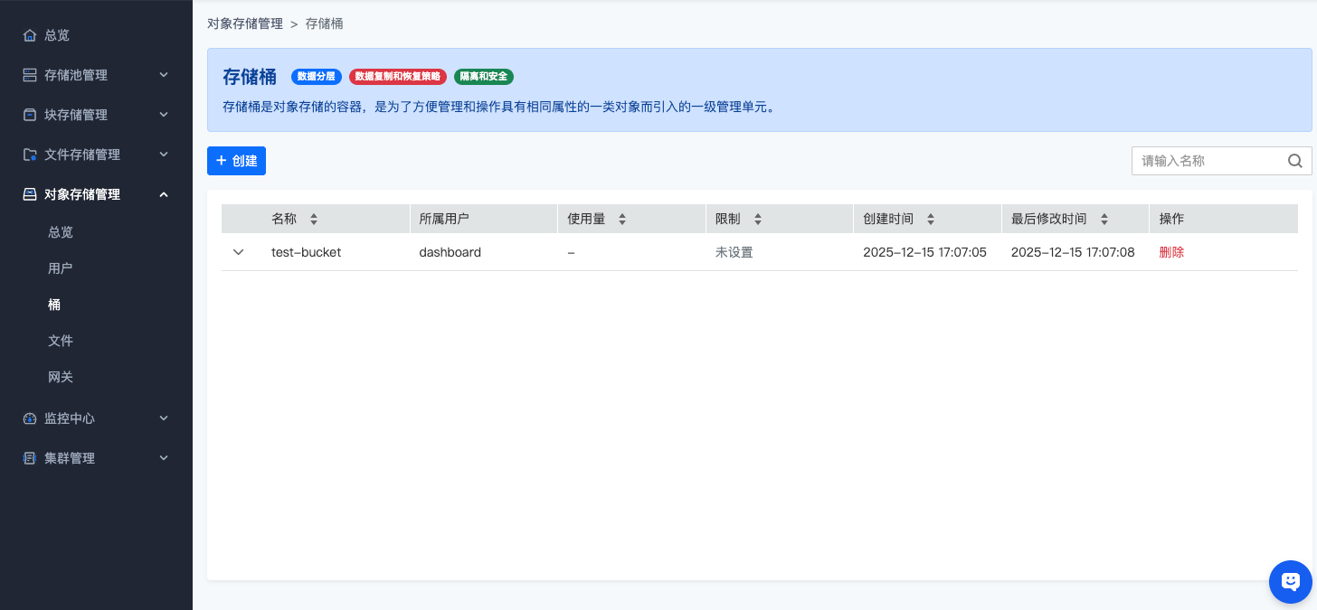 - 在左侧导航栏点击 对象存储 → 桶,进入 RGW 存储桶列表页面;
