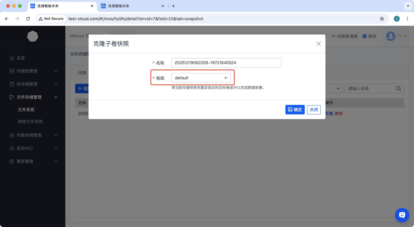 - 在克隆配置窗口中,选择目标子卷组(指定快照克隆后归属的子卷组);