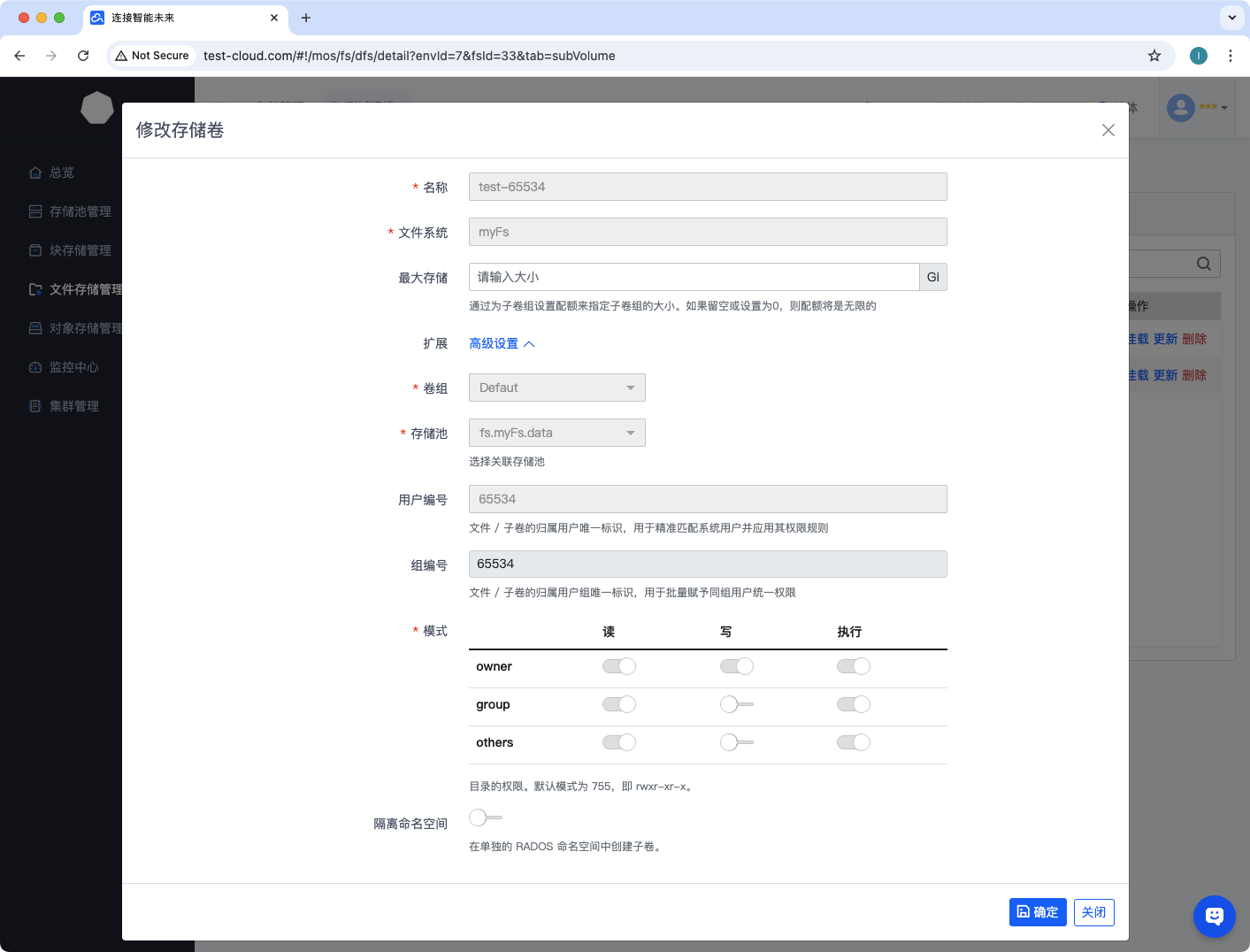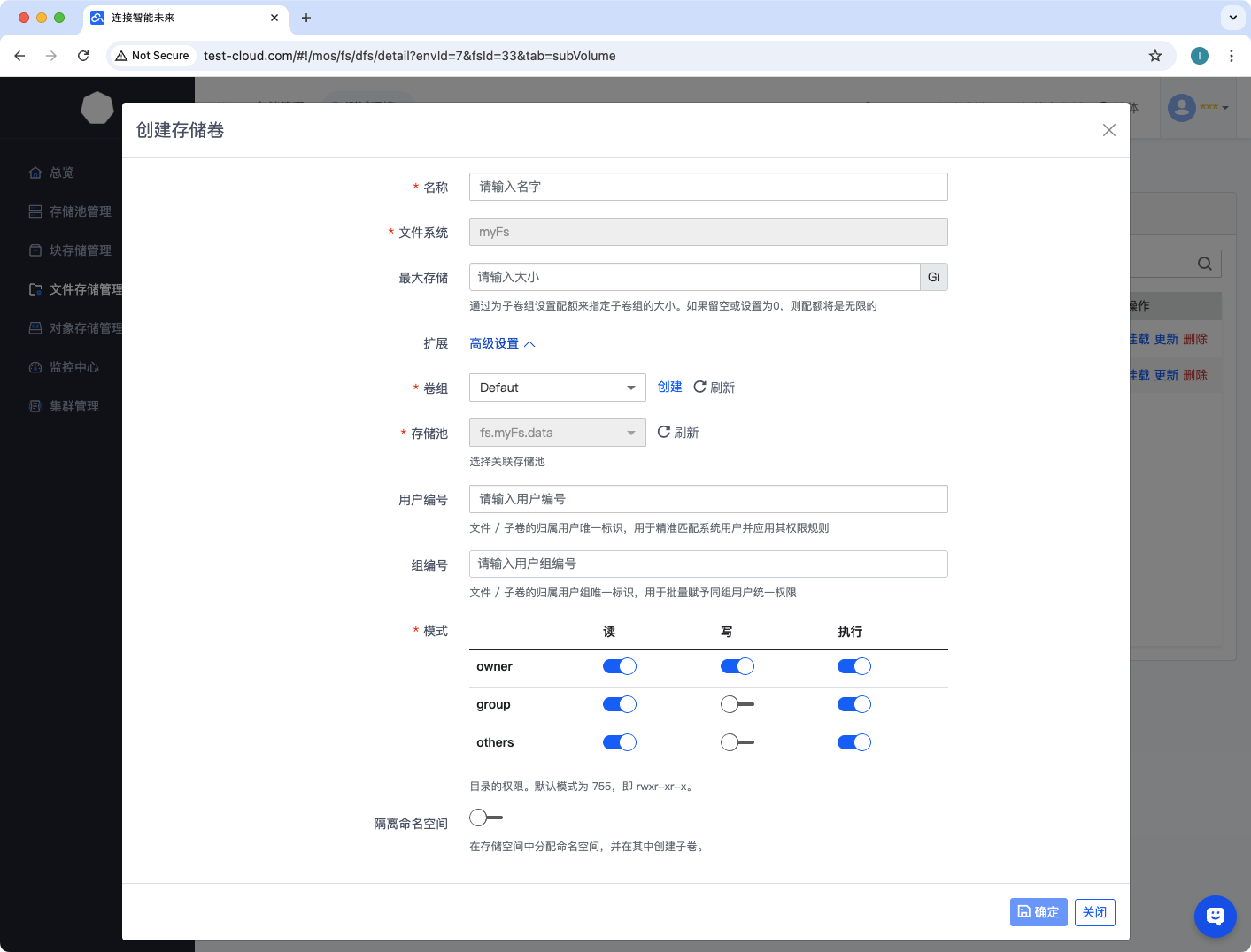 | 隔离命名空间 | 实现子卷数据的逻辑隔离,防止数据干扰 | 1. 勾选框选项,默认 “开启”;2. 存储敏感数据时必须开启,需共享数据可手动关闭 |