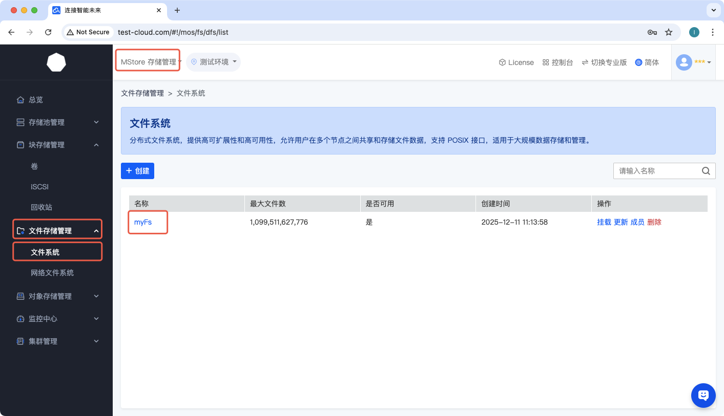 - 登录系统后,进入“文件系统列表”页面,在列表中定位需要操作的目标文件系统;