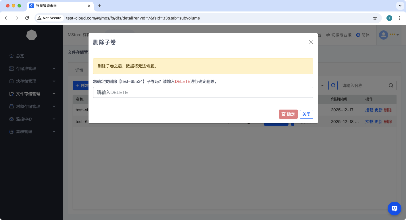- 在弹窗中输入子卷名称进行二次校验(防止误点),确认无误后点击“确认删除”按钮;