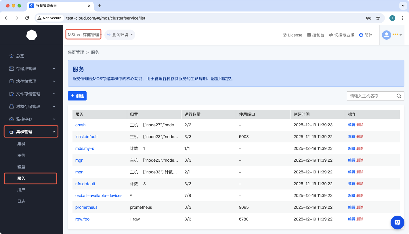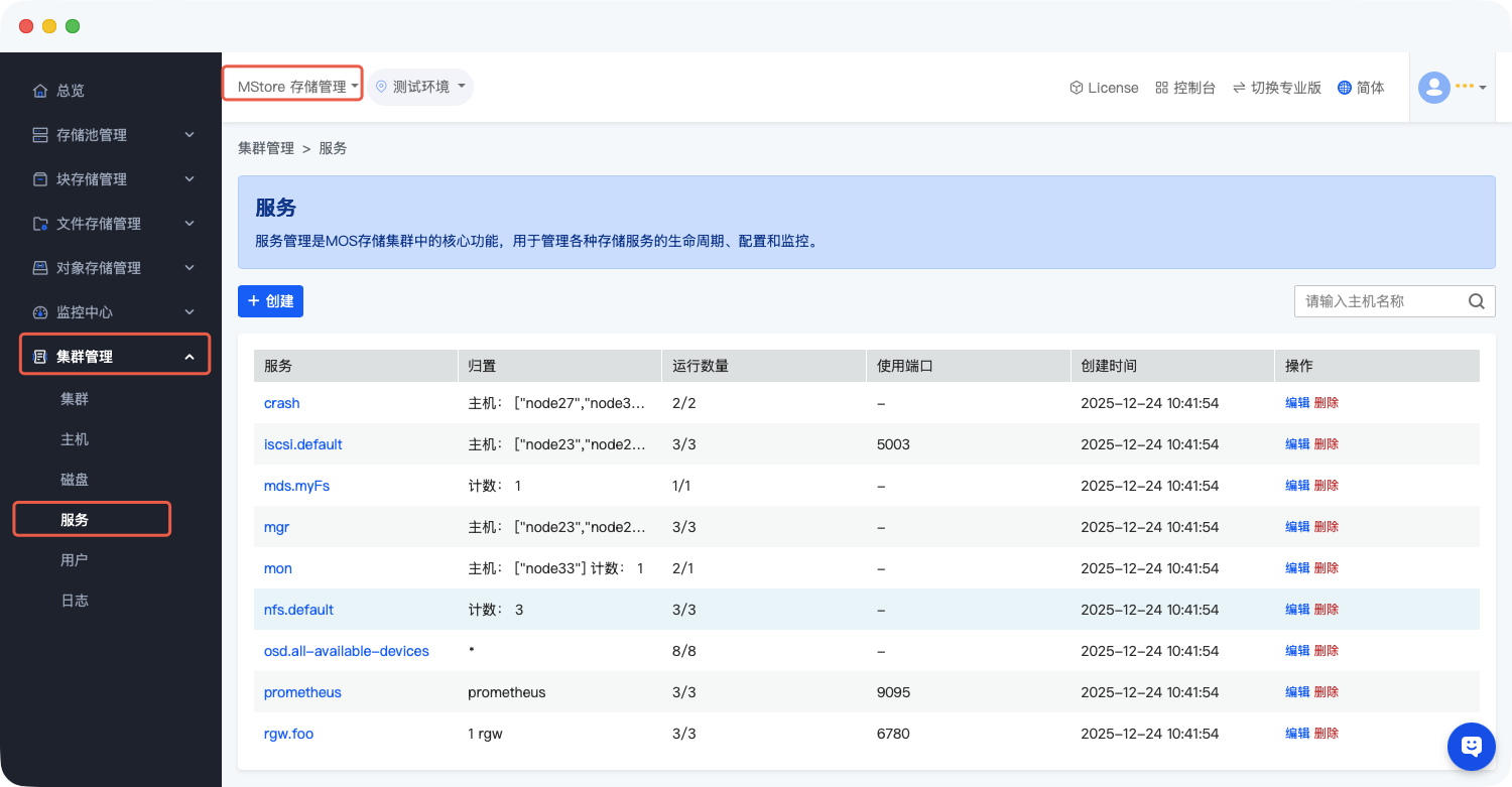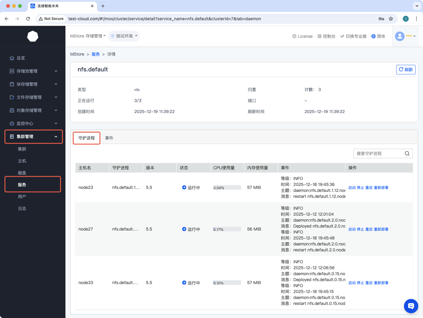 - 提交创建请求后,自动返回服务管理页面,在服务列表中找到名称为 “nfs.xxx”(例如 “nfs.obj-svc-01”,名称为 “类型 + 编号” 组合)的服务条目;