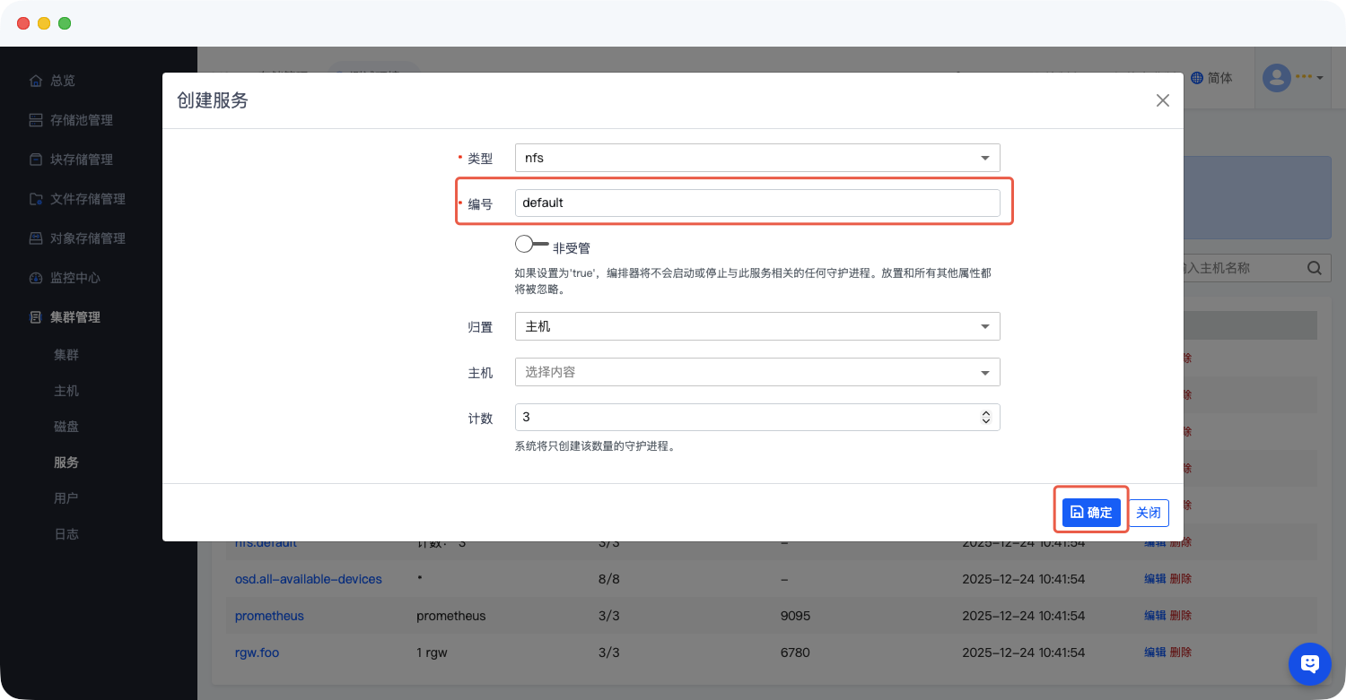 - 非受管:保持默认未勾选状态(勾选后集群将不管理该服务的守护进程);