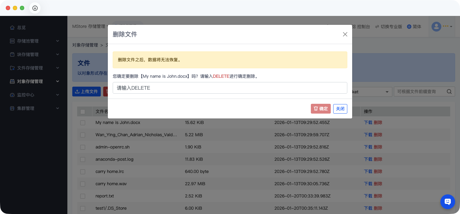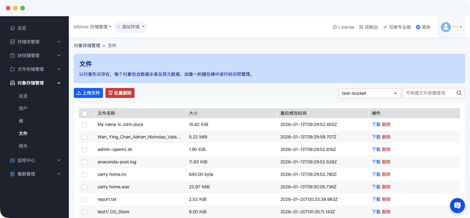 本文档详细介绍MStore云平台对象存储管理模块中文件的各项操作流程,包括页面进入、文件上传、下载、删除及批量删除,帮助用户快速掌握文件管理核心功能的使用方法。