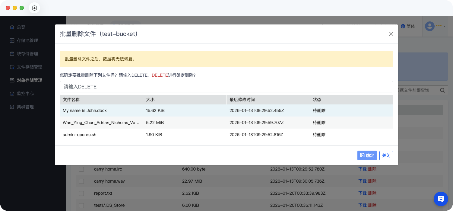 - 在弹出的确认批量删除对话框中,仔细核对删除文件数量及名称,确认无误后点击【确认】按钮,完成批量删除;点击【取消】则放弃删除操作。