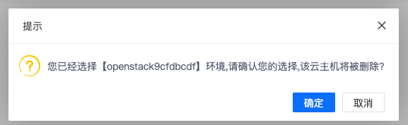 如需删除集群,点击集群详情页的删除按钮,弹出确认提示框 “您已经选择【openstack9cfdbcbdf】环境,请确认您的选择,该云主机将被删除?”: