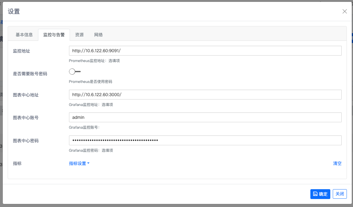 - 图表中心地址:填写 Grafana 的访问地址(如http://10.6.122.60:3000/),用于可视化展示监控数据。