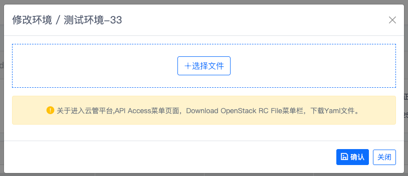 - 点击 *+ 选择文件 *,上传最新的clouds.yaml文件(若 OpenStack 平台的认证信息、API 地址变更,需重新下载该文件)。