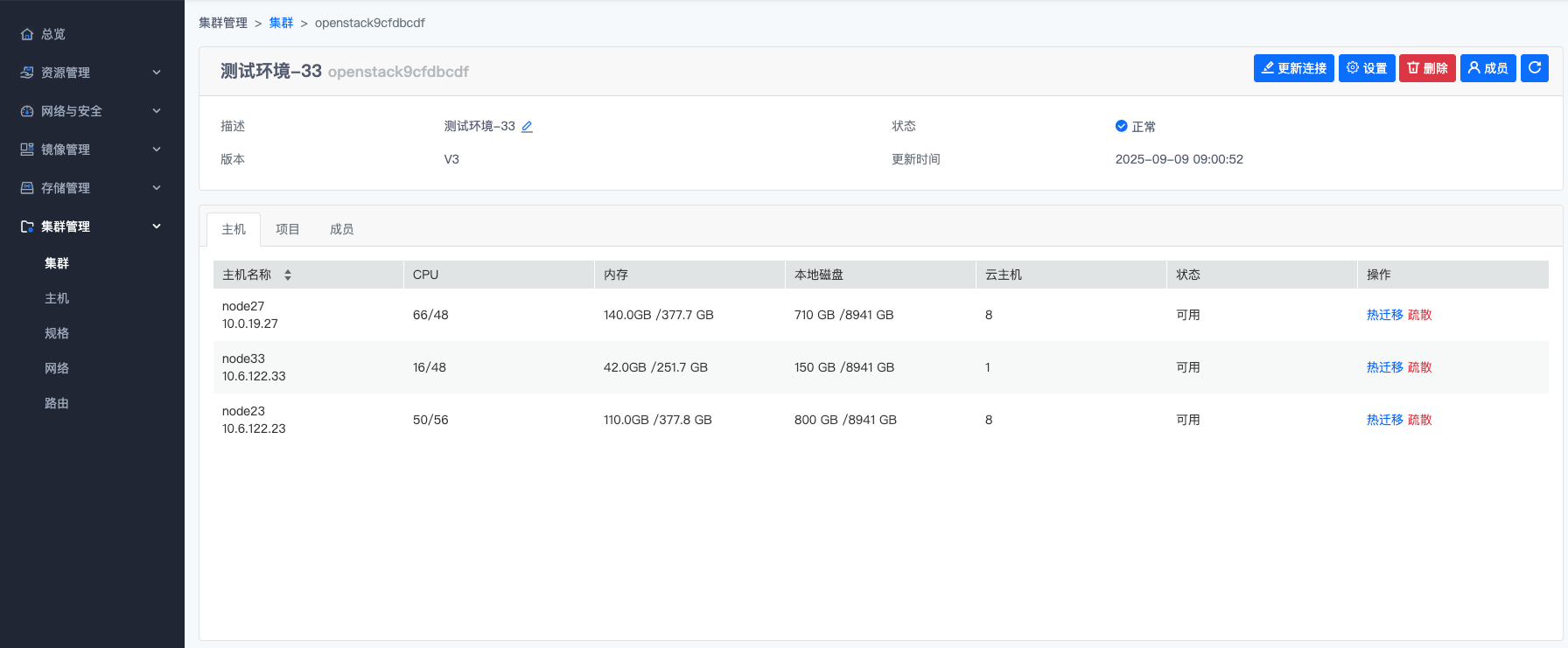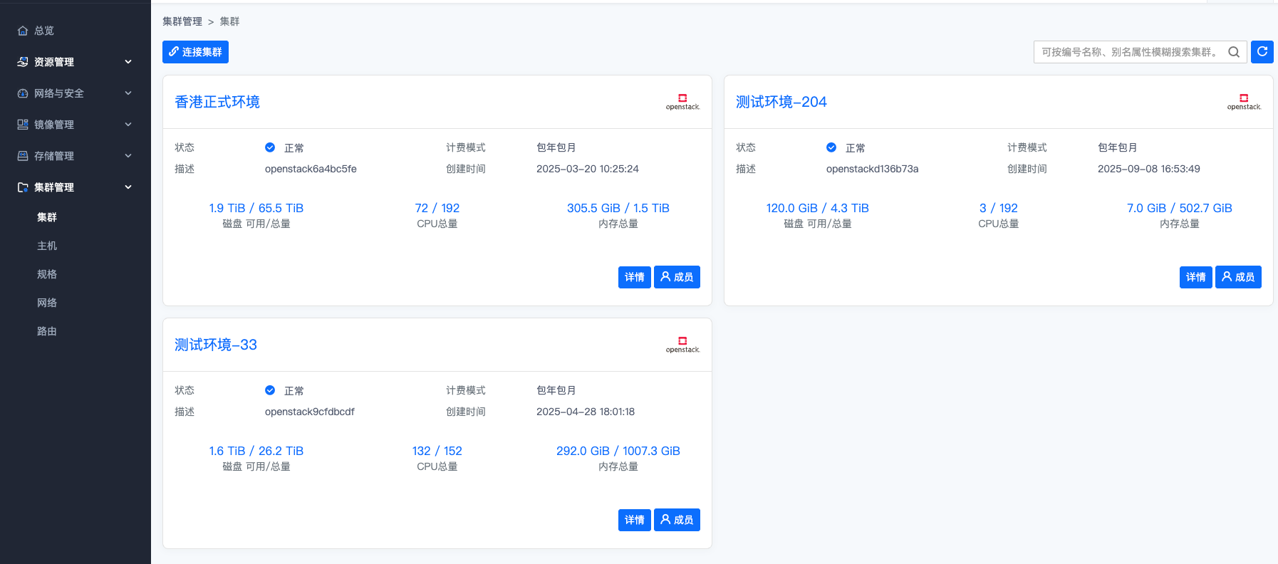 - 描述:可点击编辑图标修改,用于补充集群的业务说明(如 “测试环境 - 33 用于 OpenStack 功能验证”)。