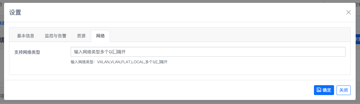 - 支持网络类型:输入集群支持的网络技术类型,多个类型以 “,” 分隔(如VXLAN,VLAN,FLAT,LOCAL)。其中: