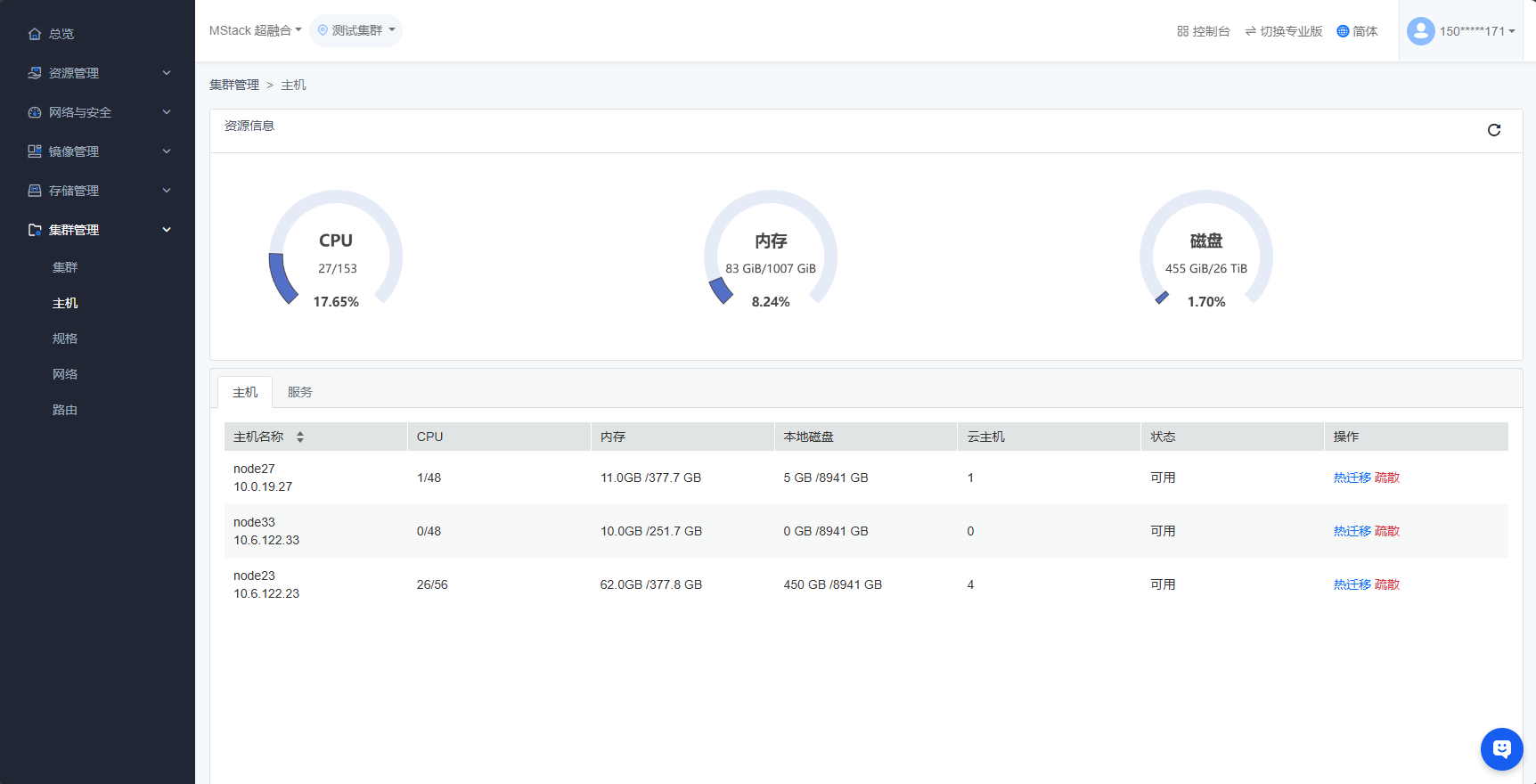 在“集群管理”–“主机”–“主机”中可以查看CPU/内存的分配情况和云主机的数量。