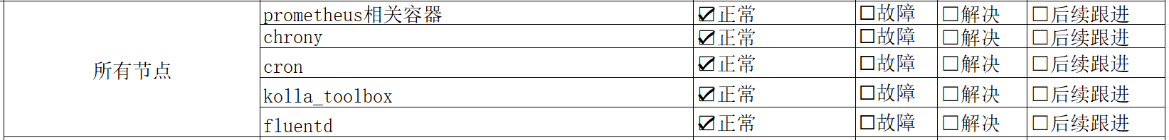 # 如果有处于非Up状态的异常容器先查看是否为人工关闭,若不是人为关闭后续与客户进行确认。 ansible -i /root/multinode control -m shell -a "docker ps -a | grep -v Up"