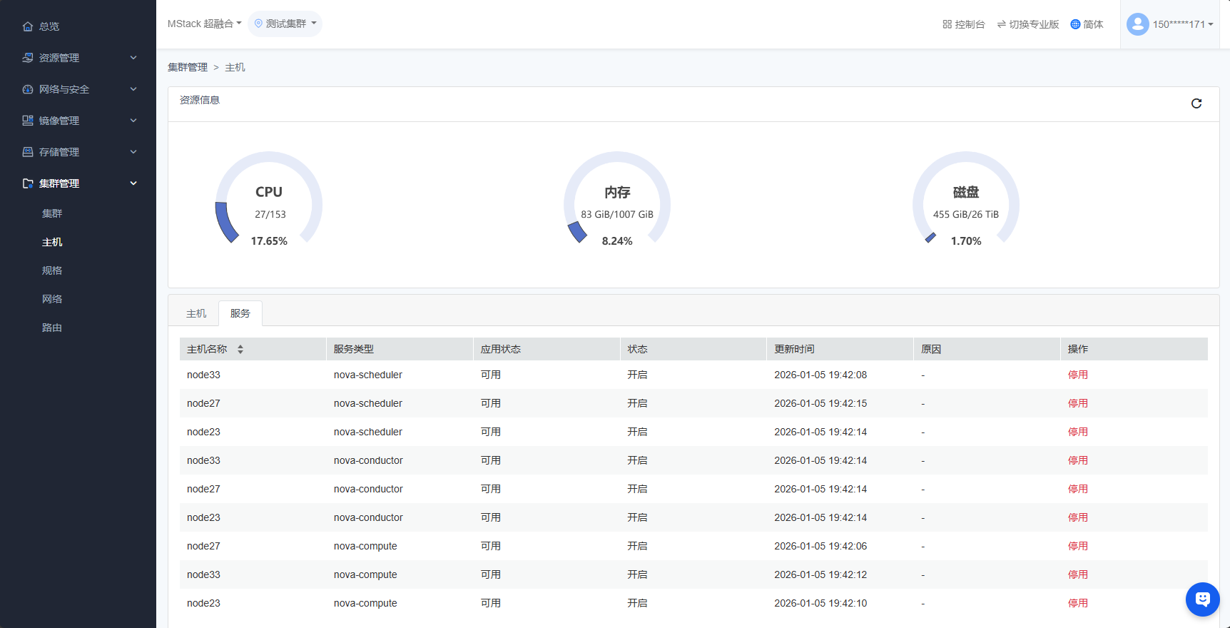 在“集群管理”–“主机”–“服务”中中查看计算、块存储、网络