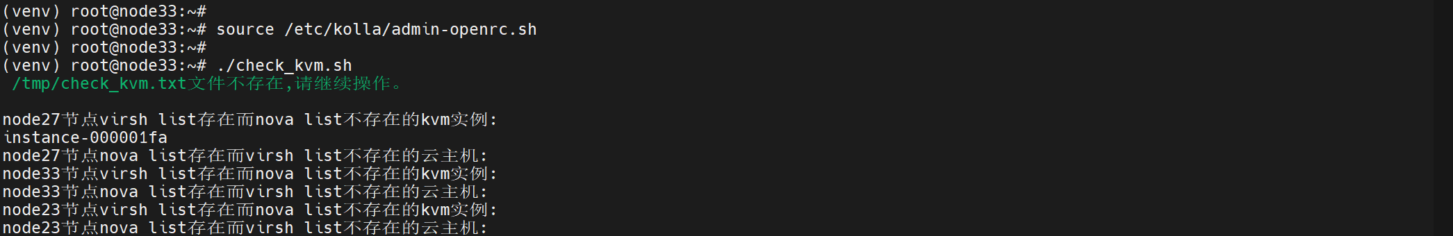 cat /tmp/check_kvm.txt执行结果如下,发现node27节点kvm中有一个名字为instance-000001fa的虚拟机和数据库存在不一致,需要跟进处理