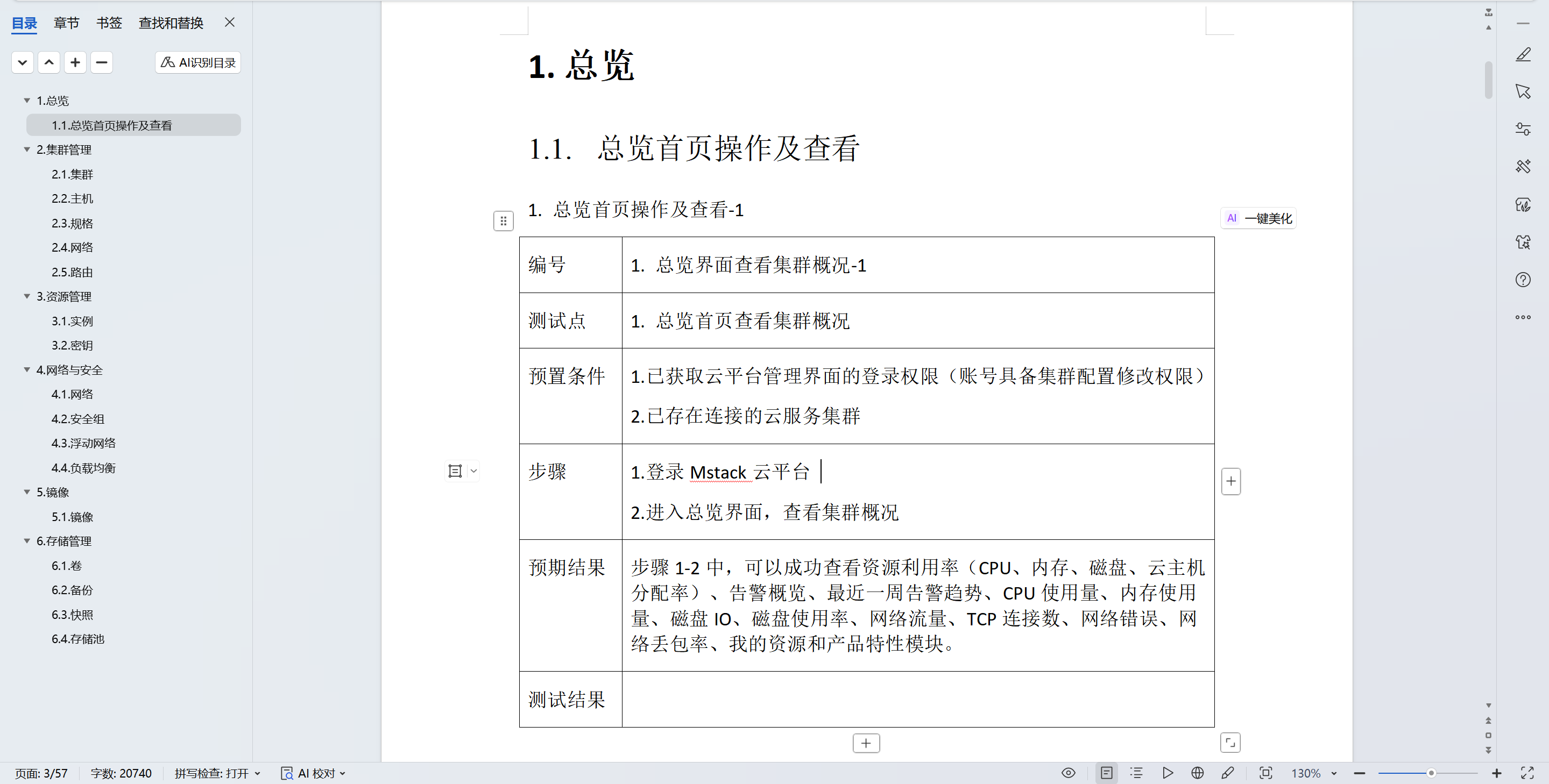 测试报告以 Excel 格式汇总输出,是对 MStack v1.1 产品测试工作的全面总结。报告核心内容包含总览、集群管理、资源管理、网络与完全、镜像、存储管理6大模块的功能测试详细情况,单个功能包含编号、测试点、预置条件、步骤、预期结果和测试结果,结构清晰、报告详细。