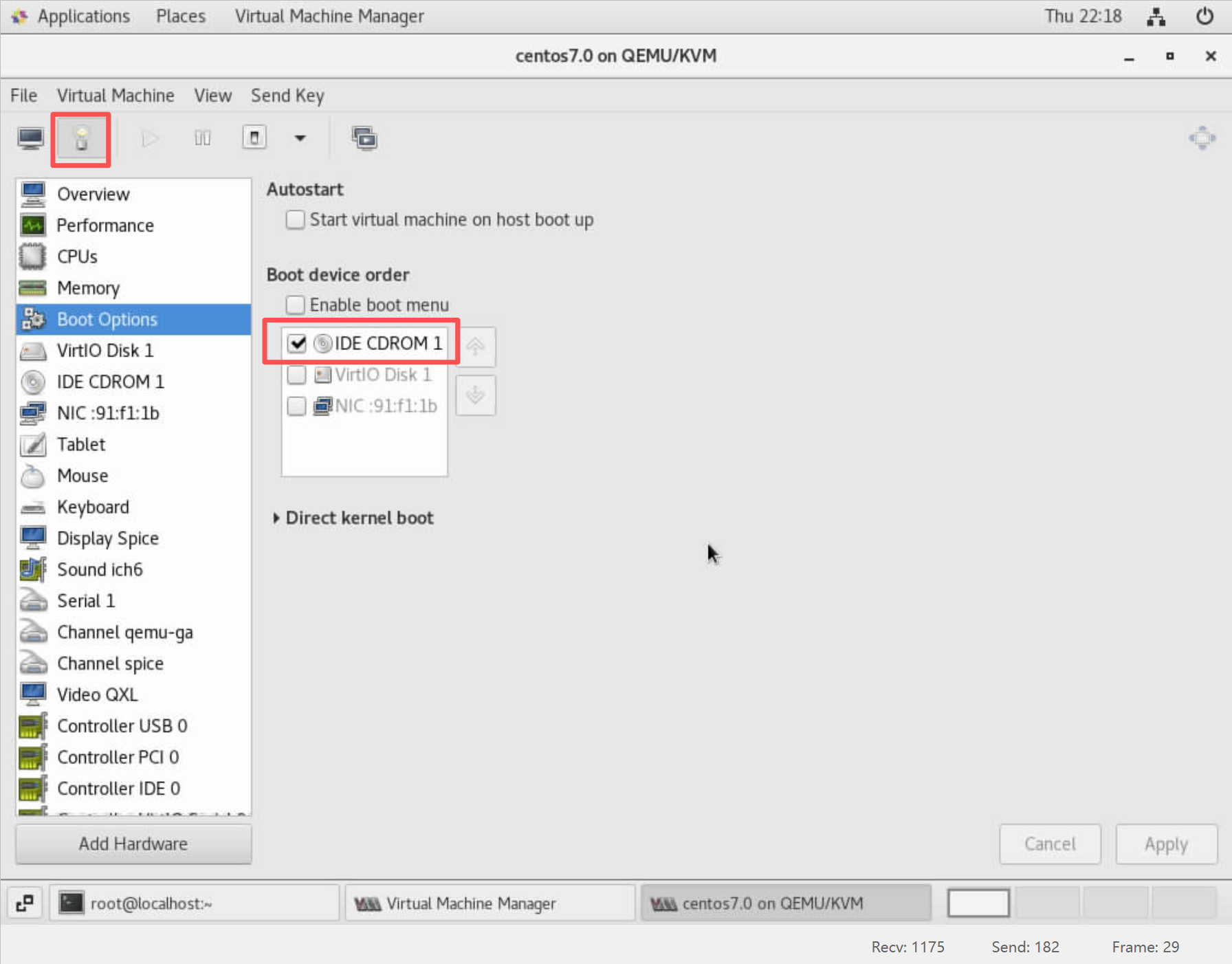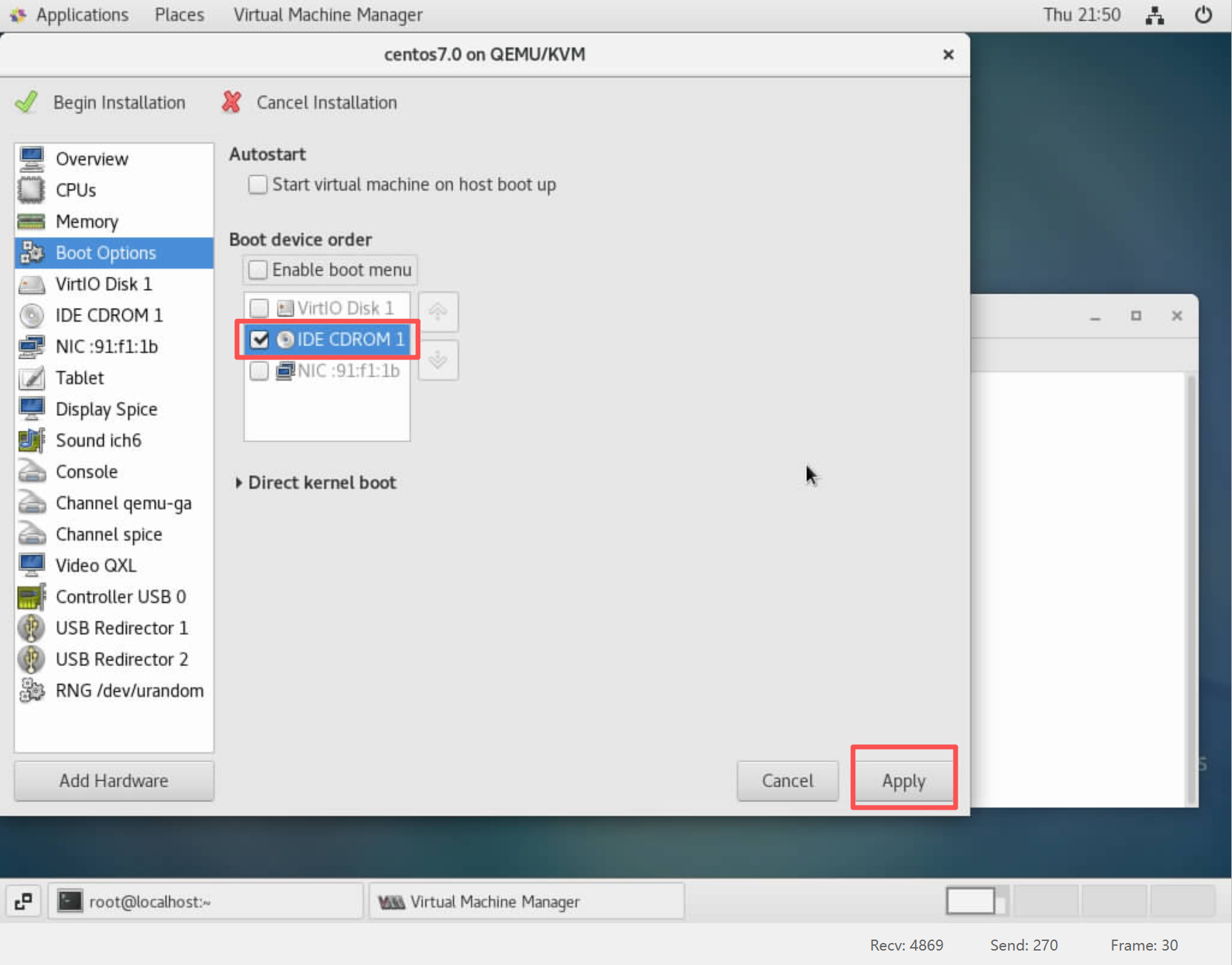 - 设置系统启动从IDE虚拟光驱引导启动(点击“Apply”应用):