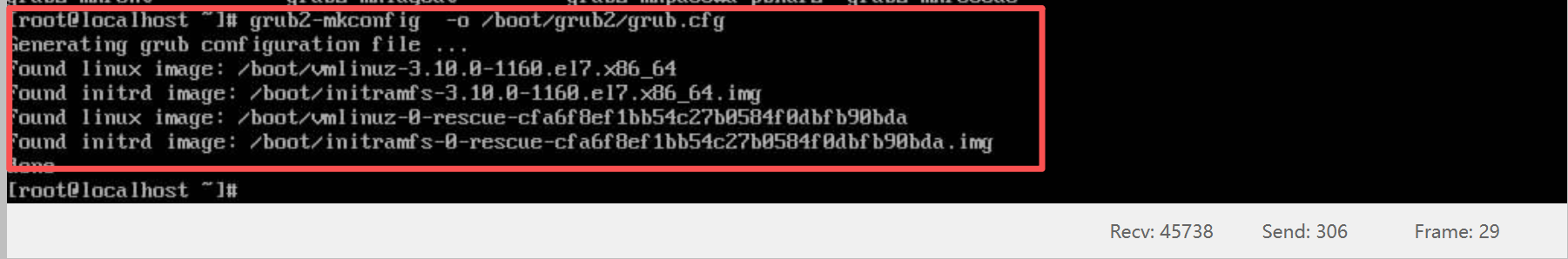 然后执行grub2-mkconfig -o /boot/grub2/grub.cfg命令让其配置生效: