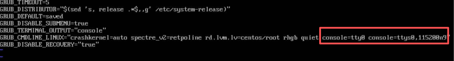 编辑/etc/default/grub文件,在参数GRUB_CMDLINE_LINUX后面加上console=tty0 console=ttyS0,115200n9: